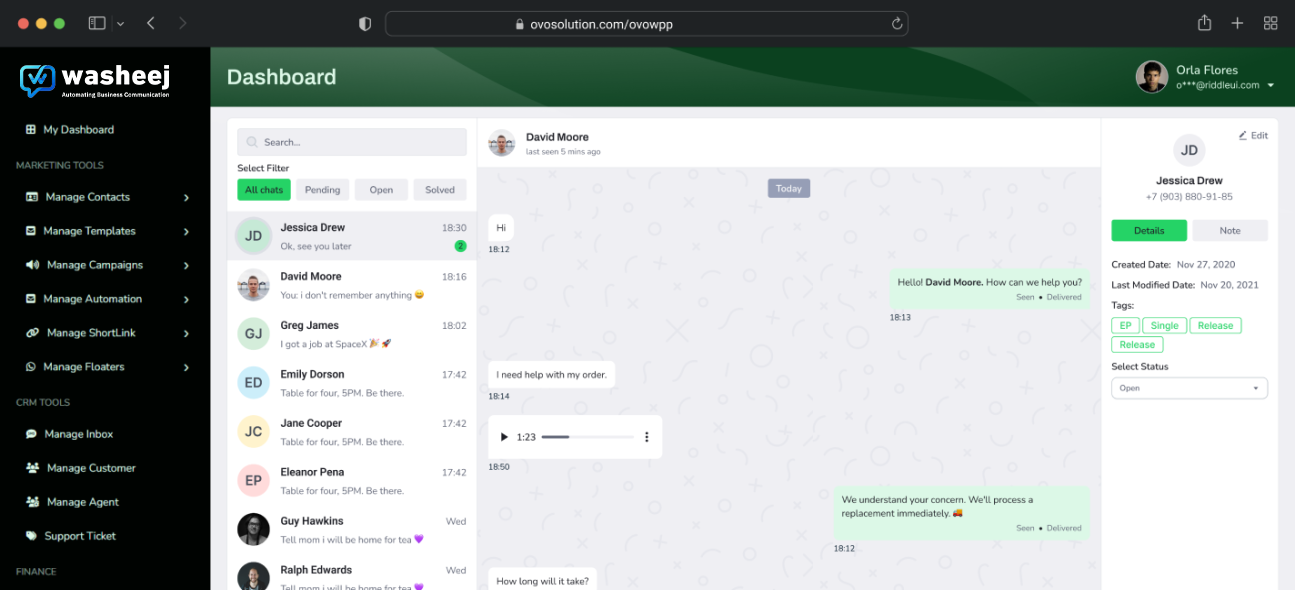 يقدم وشيج أدوات واتساب CRM وأتمتة الرسائل وتقسيم جهات الاتصال وصندوق وارد متعدد الوكلاء وتحليلات الحملات وتتبع العملاء المحتملين.